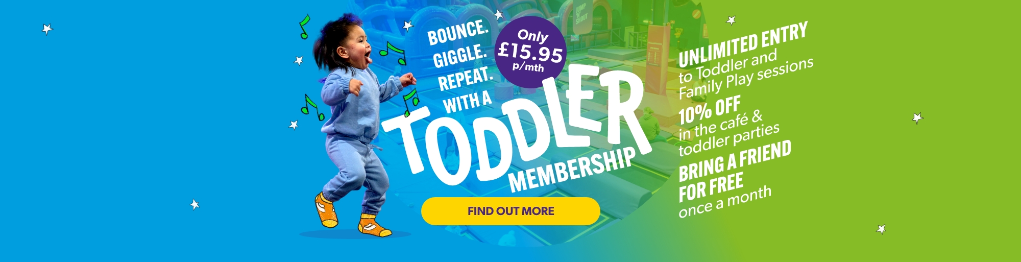 Interconnected Trampolines, Dodgeball, Toddler Sensory Play, Soft Play, Ninja challenges, Climbing walls and high ropes, Giant Airbags, Reaction walls & much much more. *Activities may vary by park.