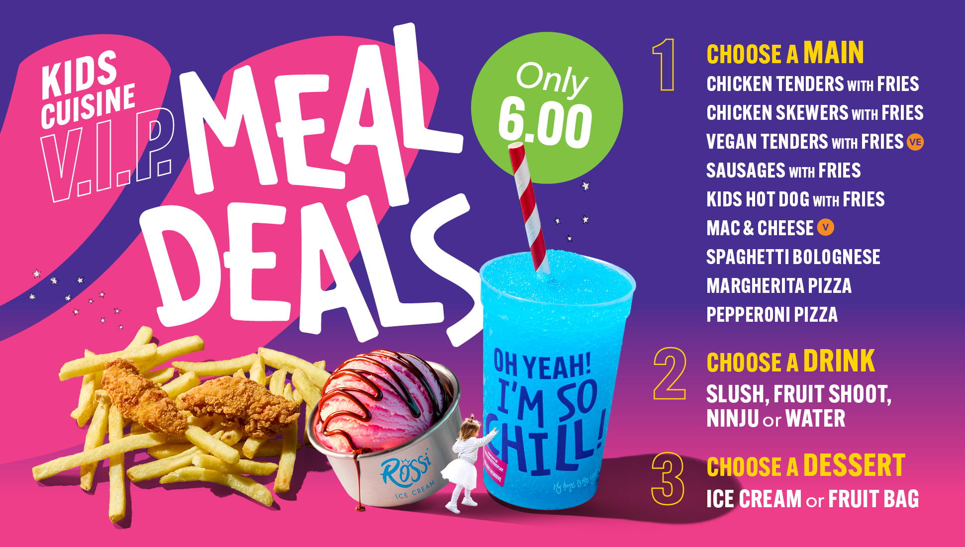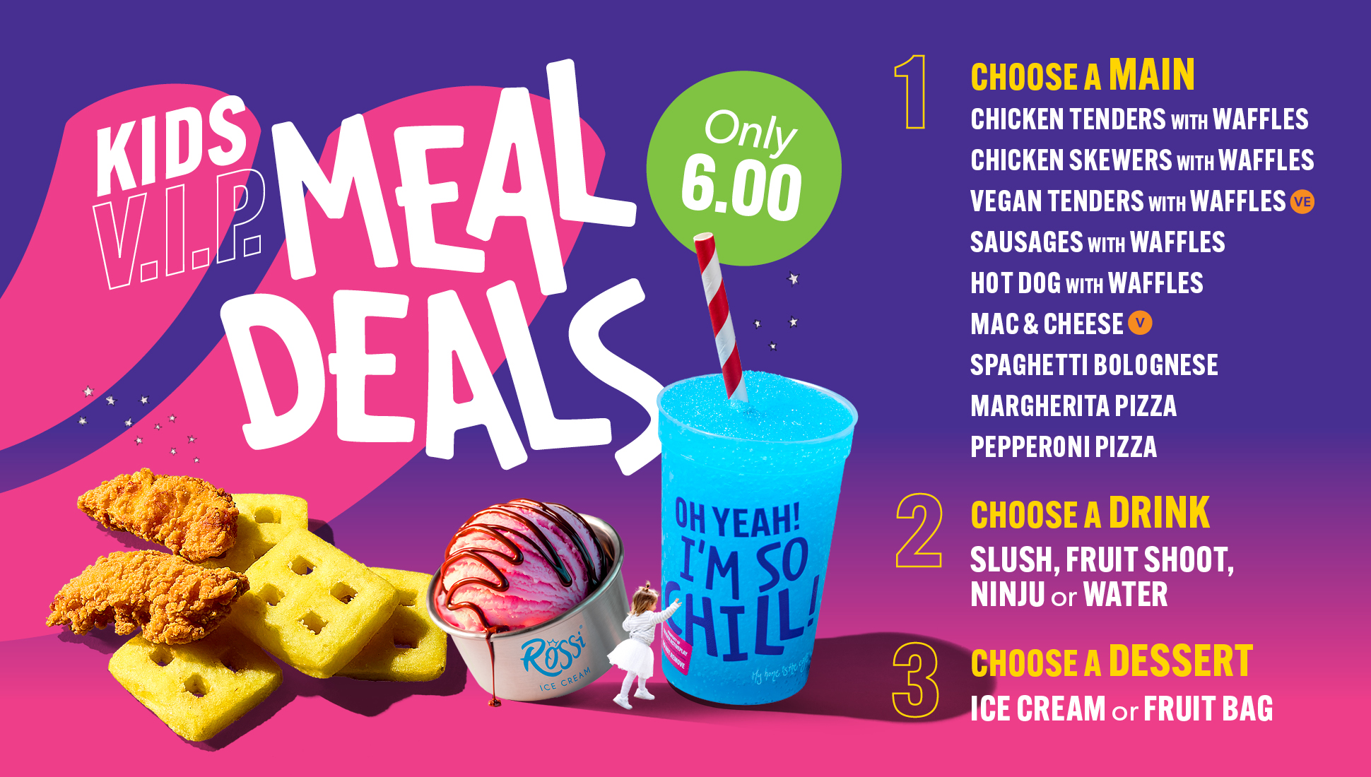 Treat little adventurers to a great-value meal deal that keeps bellies full and energy levels high. Our VIP Meal Deals include a kids’ main, a drink and a dessert – all for just £6.